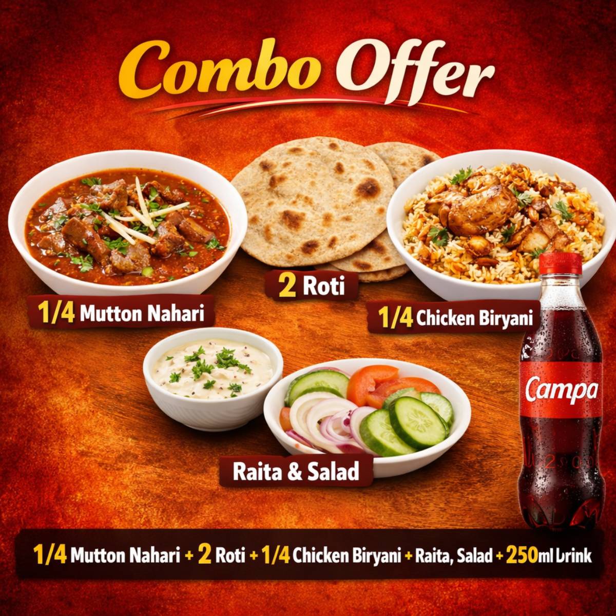 The rich and slow-cooked Mutton Nahari offers deep traditional Awadhi flavour, while the aromatic Chicken Biryani provides perfectly spiced basmati rice with juicy chicken pieces. The addition of soft rotis, cooling raita and fresh salad creates a balanced and filling meal that satisfies hunger completely. The cold drink adds a refreshing finish to the combo.